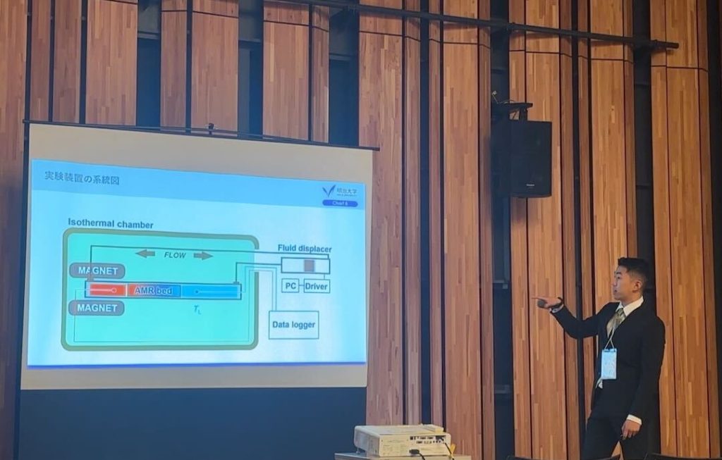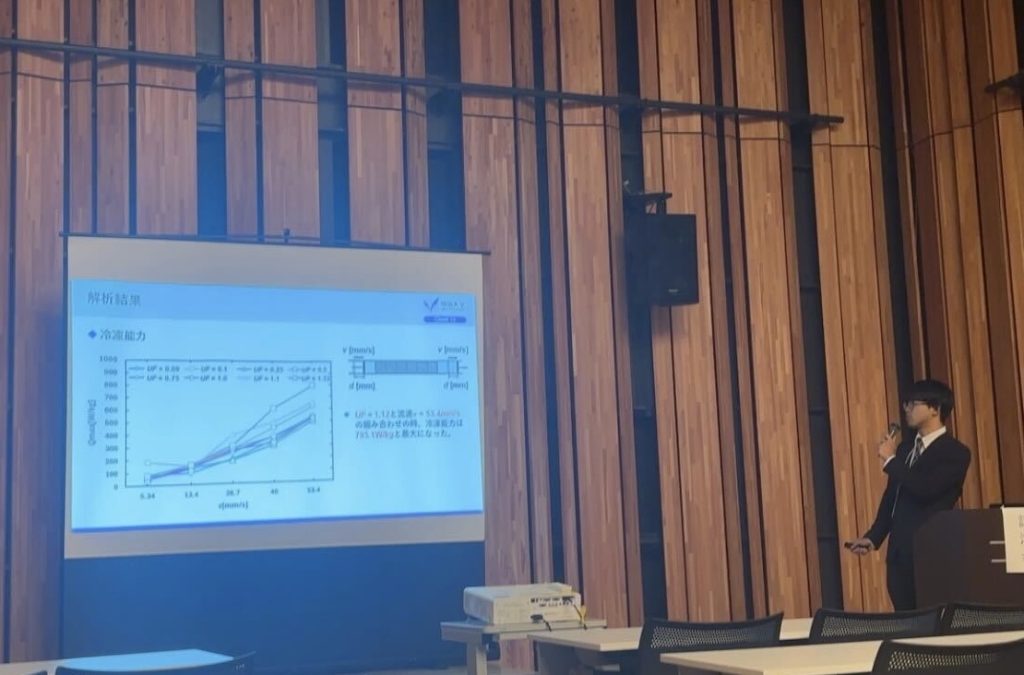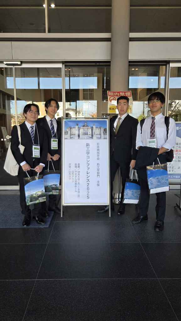 2025年10月4日〜10月5日の期間で、やまぎん県民ホール・山形テルサで開催された 日本機械学会 熱工学コンファレンス2025 において、花岡侑祐君(M2)が「階層構造型磁気冷凍装置の温度差生成挙動に及ぼす運転開始温度の影響」という題目で、越川達也君(M2)が「回転型磁気冷凍システムにおけるサイクル周波数が温度差生成に及ぼす影響」という題目で、上條大樹君(M2)が「磁気冷媒と熱交換流体の間の熱交換特性が磁気ヒートポンプの冷凍能力に及ぼす影響」という題目で、堀江麗央君(M2)が「固体-固体相転移材料から構成されるヒートシンクの熱吸収特性」という題目で、研究成果の発表を行いました。
