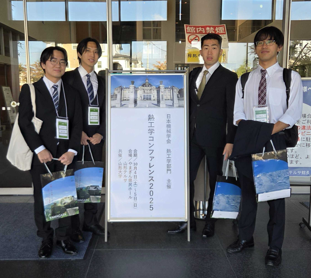 2025年10月4日〜10月5日の期間で、やまぎん県民ホール・山形テルサで開催された 日本機械学会 熱工学コンファレンス2025 において、花岡侑祐君(M2)が「階層構造型磁気冷凍装置の温度差生成挙動に及ぼす運転開始温度の影響」という題目で、越川達也君(M2)が「回転型磁気冷凍システムにおけるサイクル周波数が温度差生成に及ぼす影響」という題目で、上條大樹君(M2)が「磁気冷媒と熱交換流体の間の熱交換特性が磁気ヒートポンプの冷凍能力に及ぼす影響」という題目で、堀江麗央君(M2)が「固体-固体相転移材料から構成されるヒートシンクの熱吸収特性」という題目で、研究成果の発表を行いました。