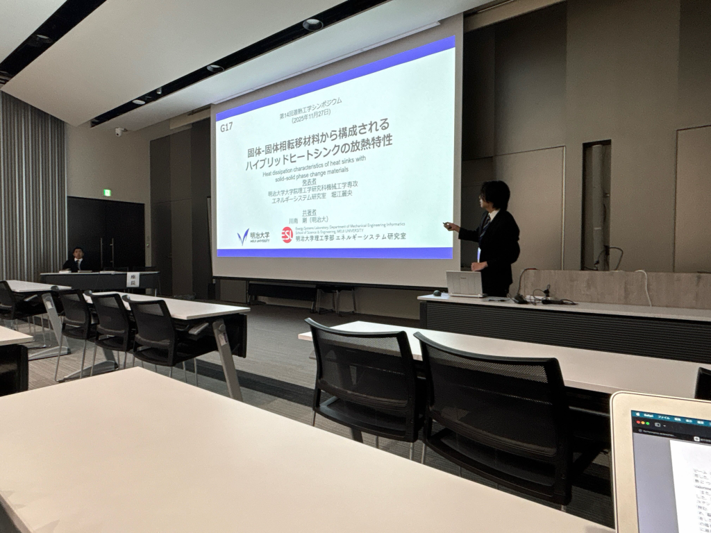 2025年11月26日〜11月27日の期間で、で開催されたにおいて、堀江麗央君(M2)が「固体-固体相転移材料から構成されるハイブリッドヒートシンクの放熱特性」という題目で、金子平君(M1)が「撥水性冷却面を用いたエアブロー除雪機構の実験的評価」という題目で、研究成果の発表を行いました。